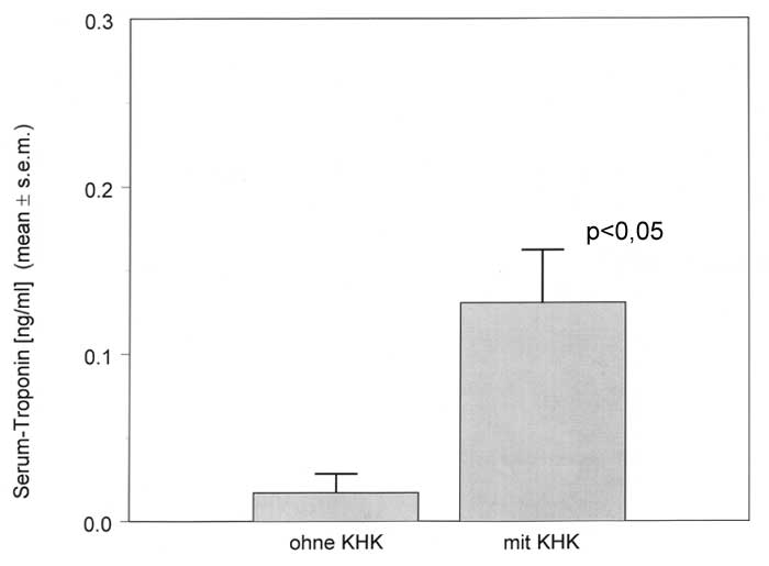 Die Bedeutung des Troponin I als Marker kardialer Mikronekrosen ist heute akzeptiert. Bei 76 Patienten überprüften wir, ob sich durch ergometrische Belastung Troponinanstiege im Serum nachweisen lassen. Alle Patienten wiesen eine leichte stabile Angina pectoris auf (Schweregrad CCS II), jeder Patient wurde ca. 24 h nach der Ergometrie einer Koronarangiographie unterzogen. Entsprechend des Koronarbefundes wurden die Patienten in zwei Gruppen eingeteilt. Gruppe A ohne Koronarsklerose (n=26), Gruppe B mit Koronarsklerose (Stenosegrad >70 %) (n=48). Die quantitative Bestimmung des Serum-Troponins wurde nach Ultrafiltration (Ultrafree–4 Konzentrator, Millopore, USA) mit Hilfe eines konventionellen Enzymimmunoessay (Abbot) direkt vor sowie 12 h nach der Ergometrie vorgenommen. Im Vorversuch ergab sich eine Konzentrierung des Troponins um ca. den Faktor 5 nach Ultrafiltration (0,17 + 0,2 ng/ml vor, 1,0 + 0,8 ng/ml nach Ultrafiltration (p<0,01) (n=11). Ergebnisse nach Ergometrie: |