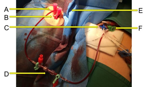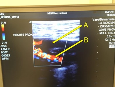 Introduction We present the case of a 49 year old female patient with severe cardiogenic shock. After insertion of an Impella CP microaxial pump (14 F) for ventricular unloading, she developed acute limb ischemia due to preexisting peripheral arterial disease with the clinical signs of pallor, pulselessness, perishing temperature of the right leg and livid toes. Figure 1: Ultrasound colour doppler image: A: no blood flow in right femoral superficial artery; B: preserved flow in profund artery Figure 2: Placement of catheters: A: venous sheath (to be removed); B: arterial antegrade perfusion cannula in ischemic right patient leg; C: central venous line; D: double-male perfusion-adapter; E: Impella device (covered); F: retrograde arterial cannula („donor“) Figure 3: Bed side angiogram (application of contrast agent via antegrade shunt): long segment stenosis and thrombus of the right femoral superficial artery, distinct collateral network