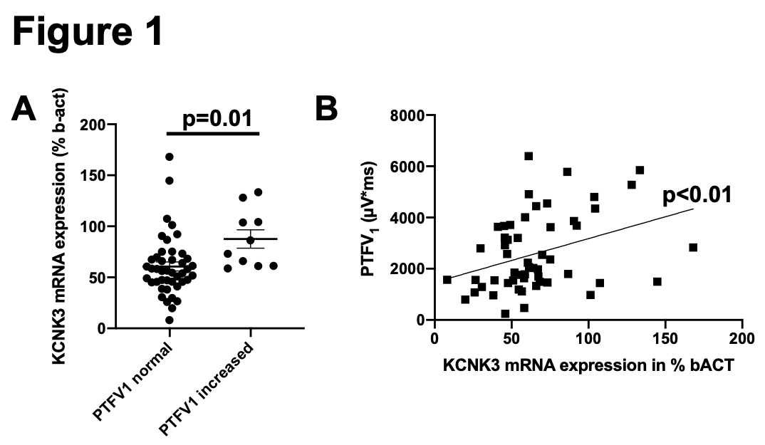 Methods: We enrolled 54 patients undergoing coronary artery bypass grafting and analyzed right atrial appendage biopsies for expression of KCNK3 (TASK-1) mRNA (real-time qPCR). All samples were measured as triplicates and the averages were used for the comparative threshold cycle (Ct) relative quantification analysis method and expressed as percent of β-actin. Echocardiography was performed to assess left ventricular ejection fraction (LVEF). PTFV1 was assessed as the product of negative p-wave amplitude and duration in lead V1 and defined as abnormal if ≥4000 ms*μV. Student’s t-test was performed to compare normally distributed continuous variables, additionally simple linear regression was performed. Multivariate regression analyses were performed to account for potential confounders.
