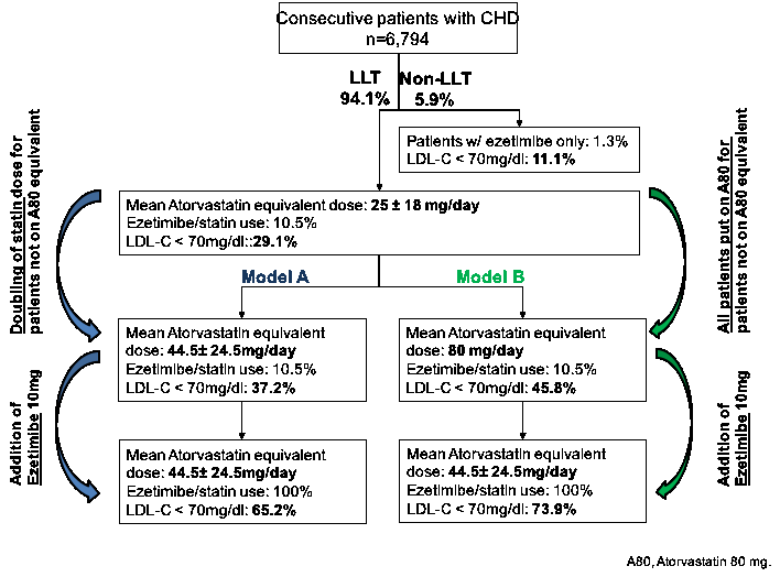 Background: Lipid treatment is established in coronary artery disease (CAD) patients with an LDL-cholesterol threshold of 70 mg/dL as target for therapy. After determining the percentage of threshold attainment in CAD patients, we aimed to model the effect of doubling statin dose and/or administering ezetimibe. Methods: 6,794 CAD patients were enrolled in eighteen countries in Europe, the Middle East, South- and East Asia to document patient characteristics, including medication and a current lipid profile during 2012 to 2014 under real life conditions in physicians’ offices and hospitals. We modeled doubling of statin dose in all statin treated patients not on atorvastatin 80 mg or equivalent with a 6% reduction of LDL-C per step. This was followed by modeling the addition of ezetimibe in all patients not on ezetimibe, leading to an additional 24% reduction (Model A) or alternatively atorvastatin 80 mg in all patients followed by adding ezetimibe (Model B). Results: In DYSIS II CAD, the mean LDL-C level was 88 ± 36 mg/dL; 29.1% attained LDL-C <70 mg/dL. 82.3% were on statin monotherapy, 7.2% did not take statins, while 1.3% received ezetimibe in monotherapy. 65.2% of patients could reach the LDL-C threshold with doubling of the statin dose and addition of ezetimibe; 73.9% by titrating all patients to Atorvastatin 80 mg and addition of ezetimibe. Details in figure 1. Conclusion: Our analysis indicates that in real life practice the use of widely available high intensity statins together with ezetimibewould dramatically increase the percentage of CAD patients reaching the LDL-C <70 mg/dL target from currently less than 30% to 65% or even 73.9% using full dose of Atorvastatin in combination with ezetimibe. |