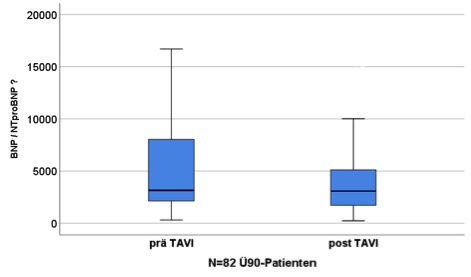 Ergebnisse: Im Zeitraum Juli 2008 bis November 2017 wurden in unserer Klinik mehr als 1750 TAVI Eingriffe durchgeführt. 82 Patienten (4.7%) waren über 90 Jahre alt (range 90-105 Jahre). Das Durchschnittsalter der Patienten lag bei Implantation der TAVI bei 91.7 Jahren, der Männeranteil bei 24.4%. Der durchschnittliche EUROSCORE II betrug 24.5 ± 15 Punkte. Die Patienten konnten im Mittel über einen Zeitraum von 14 Monaten (range 0 Monate bis 6 Jahre) nachbeobachtet werden. Die postinterventionelle Krankenhausletalität lag bei 4.9%. . Das 1-Jahres-Überleben betrug 89%, das 2-Jahres-Überleben 87%. Es konnte eine Reduktion des mittleren Druckgradienten von 47 prä auf 11 mmHg nach TAVI erzielt werden. Gleichzeitig reduzierte sich das NTproBNP als Marker der neurohumoralen Aktivierung von im Mittel 6118 ± 6566 auf 4411 ± 4893 ng/ml nach TAVI<!--[if !supportAnnotations]-->[ahf_mh1]<!--[endif]-->