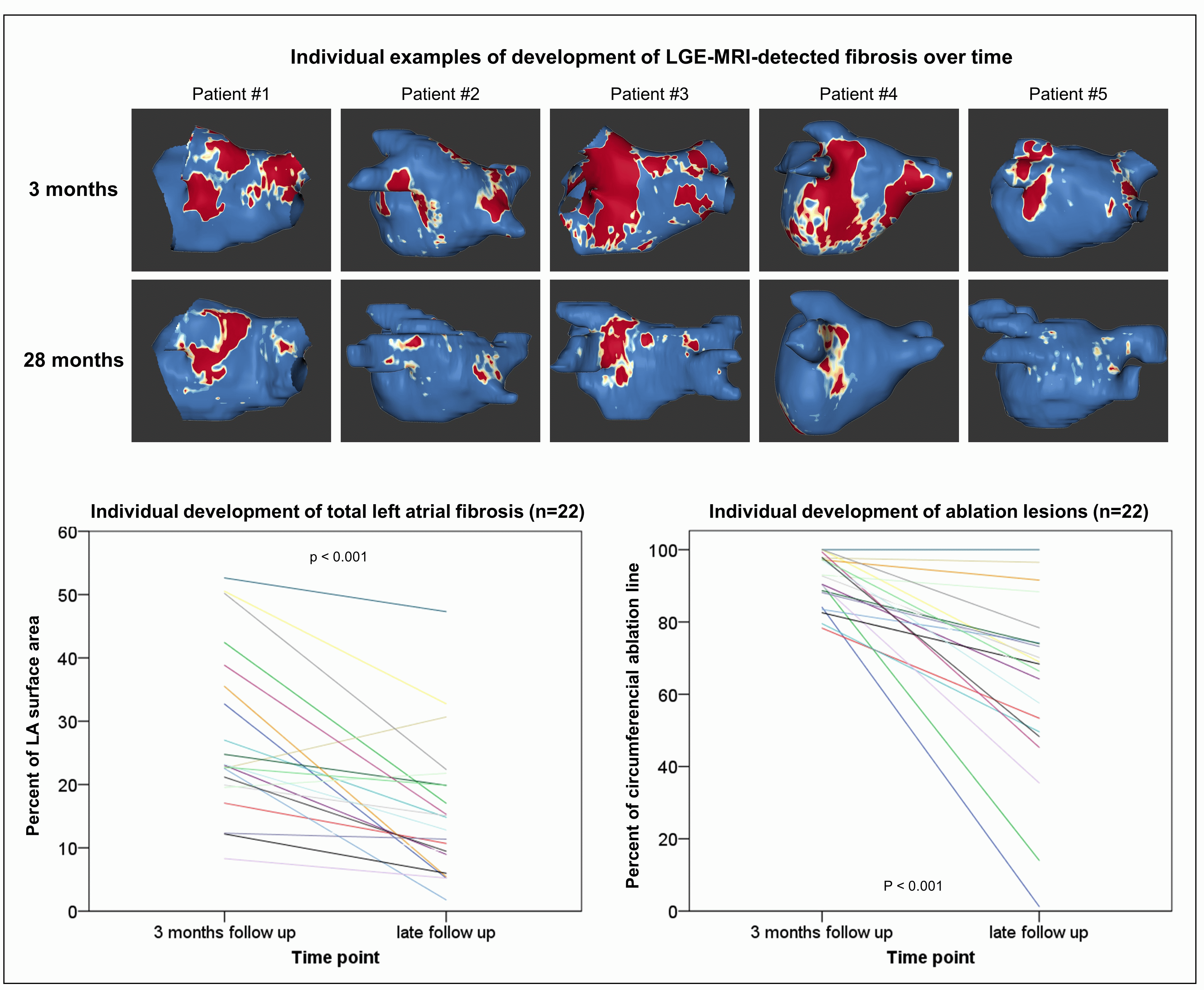 In the 22 patients analysed, LGE-MRI-detected ablation-induced fibrosis decreased from 91.7 ± 7.0% of the anticipated ablation line at a median of 3 months post ablation to 62.8 ± 25.0% at a median of 28 months (p<0.0001) (see figure for representative examples and individual development of fibrosis over time). This was also reflected by an increase in the median number of LGE-MRI-predicted gaps in the ablation lesion from 4 (3 months) to 10 (28 months). However, EAM subsequent to the second post-ablation LGE-MRI confirmed only 5% of the new gaps detected by the 28-months LGE-MRI, but agreed with the 3-months LGE-MRI in 95% of these cases. Overall agreement of LGE-MRI with EAM regarding the prediction of ablation-induced fibrosis and functional gaps was good after three months (κ 0.74; p<0.0001, negative predictive value 98%, positive predictive value 76%), but weak after 28-months (κ 0.29; p<0.0001, negative predictive value 96%, positive predictive value 31%).