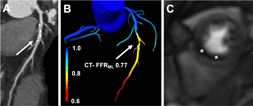 Conclusion: CT-FFRML compared to stress perfusion CMR as the reference standard shows high diagnostic power in the identification of patients with hemodynamically significant coronary artery stenosis. This could support the role of cCTA as gatekeeper for further downstream testing and may reduce the number of patients undergoing unnecessary invasive workup. Fig. 1 53-year-old male patient with suspected CAD and arterial hypertension. (A) cCTA illustrates a moderately graded stenosis (50-69%) with unclear hemodynamic relevance caused by mixed structured plaques in the mid left anterior descending coronary artery (arrow). (B) Color-coded 3-dimensional mesh created by CT-FFRML software shows a flow-limiting stenosis with a measured value of 0.77 (arrow). (C) a midventricular short axis stress perfusion CMR image demonstrates a significant perfusion deficit in the left anterior descending coronary artery territory, which correlates with the myocardium subtended by the hemodynamically significant lesion identified on CT-FFRML; CAD = coronary artery disease; cCTA = coronary CT angiography; CT-FFRML= Fractional flow reserve derived from coronary computed tomography angiography based on machine learning algorithm; CMR = cardiovascular magnetic resonance imaging Fig. 2 ROC of Agatston score, cCTA (stenosis ≥70%) and CT-FFRML with stress perfusion CMR as reference standard. The AUC for detection of ischemia inducing stenosis by CT-FFRML was 0.89. Agatston score and cCTA (stenosis ≥70%) provide AUC values of 0.70 and 0.74 (n=138). CAD = coronary artery disease; cCTA = coronary CT angiography; CT-FFRML = Fractional flow reserve derived from coronary computed tomography angiography based on machine learning algorithm; CMR = cardiovascular magnetic resonance imaging |
