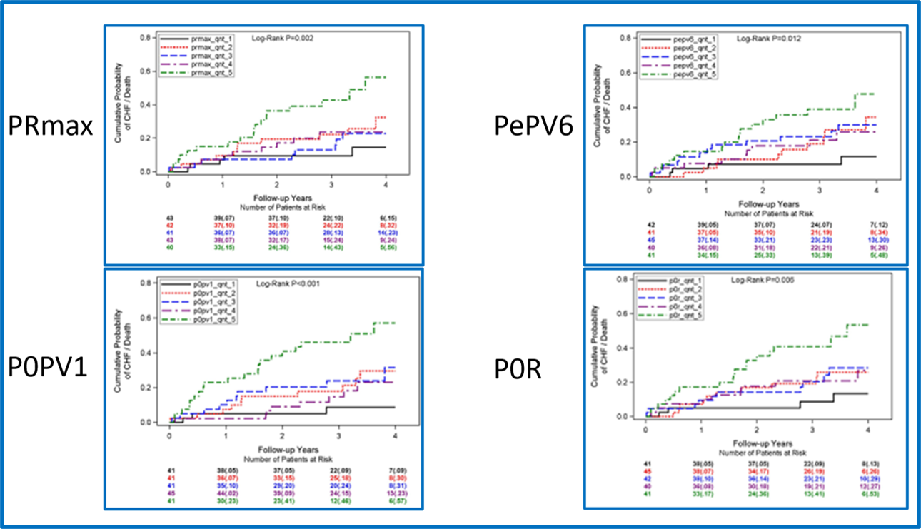 Results: Weak correlations were found between the AV delay variables (figure 2). Four of the variables (P0PV1, P0R, PePV6, PR) were significantly associated to the risk of HF or death with the upper quintile defining a high-risk HF population, as compared to quintiles 1 to 4 (see figure 3). This indicated a threshold behavior of the associations. P0PV1 was the most powerful risk predictor (Chi-square=16.31, HR for Q5 vs. Q1-4=3.12, CI=1.80-5.41, p<0.001), followed by PRmax (Chi-square=13.19, HR for Q5 vs. Q1-4=2.81, CI=1.61-4.92, p<0.001), P0R (Chi-square=10.42, HR=2.54, CI=1.44-4.48, p=0.001), and PePV6 (Chi-square=7.96, HR for Q5 vs. Q1-4=2.2, CI=1.29-4.07, p=0.005).