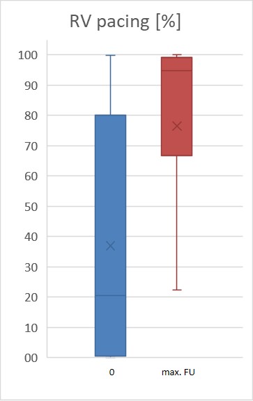 AimsThe MicraVR™ transcatheter pacing system (TPS) has been implemented into clinical routine for several years. The primary recipients are patients in need for VVI pacing due to bradycardia in the setting of atrial fibrillation (AF). Implantation safety and acute success have been reported earlier. So far only few long-term real-life data on TPS exist. We report indication, procedure but foremost TPS outcome data from two high-volume implanting German centers. MethodsBetween 2016 and 2019 188 patients were included. Procedural and acute outcome data were obtained. During follow up (FU) TPS interrogation was performed after 4 weeks and every 6 months. ResultsIn all patients TPS implantation was successful. Indication for TPS implantation in 159/188 (85%) patients was permanent or intermittent AV block III° in the setting of persistent or permanent atrial fibrillation. Further indication for TPS implantation consisted of: sinus node dysfunction (7%), intermittent higher AV blockage in setting of sinus rhythm (6%) and other indications (e.g anatomical obstacles) (2%). The mean procedure duration was 50 min [35.0-70.0]. The average acute values after system release were: thresholds: 0.5V [0.38-0.74]/0.24ms; R-wave sensing: 10.0mV [8.1-13.5]; impedance: 650 Ohm [550-783], RV-pacing demand: 16.9 % [0.9-75.9], battery-status: 3.15 V [3.12-3.16]. During FU of 723.4±597.9 days neither pacemaker failure nor infections were reported. Measurements during long-term FU: thresholds: 0.5V [0.38-0.63]/0.24 ms; sensing: 12.3mV [8.9-17.2]; impedance: 570 Ohm [488-633], RV-pacing demand: 87.1% [29.5-98.6], battery-status 3.02 V [3.0-3.1]. 43 patients died from not-device related causes. Despite a significant increase in RV-pacing demand during FU, the projected battery longevity seems to be unaffected and even outperform initial expectations (Figure 1,2). ConclusionThis to date largest German long-term data set for MicraVR™ TPS implantation revealed stable device parameter. Foremost, battery longevity seems to fulfill predicted values despite an increase in RV-pacing demand over time. Of note, no infections or system failure were observed. FiguresFigure 1: RV pacing [%] during follow-up. Figure 2: Battery [V] during follow-up.