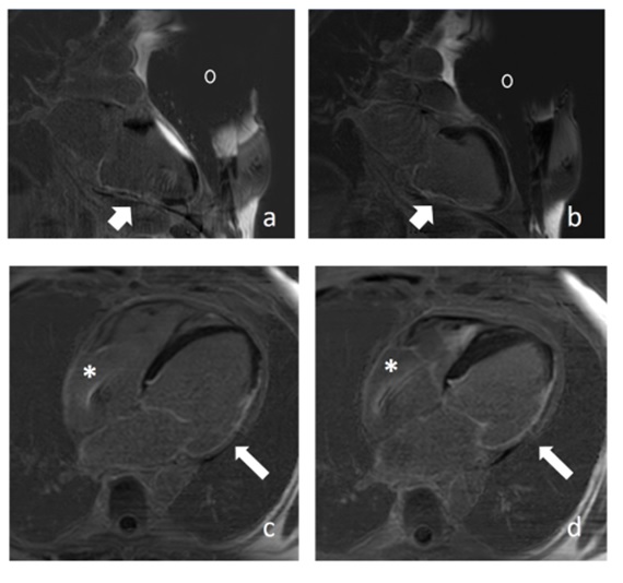 Fig. 3: Patient with ICD. a) LGE, 2CH-view. The anterior wall is covered by an hyperintensiv artifact b) WB-PSIR-LGE suppresses this artifact. c) LGE, 4CH and d) WB-PSIR LGE show comparable image quality. Arrow: myocardial scar. Asterisk: lead artifact. 0: device artifact. |