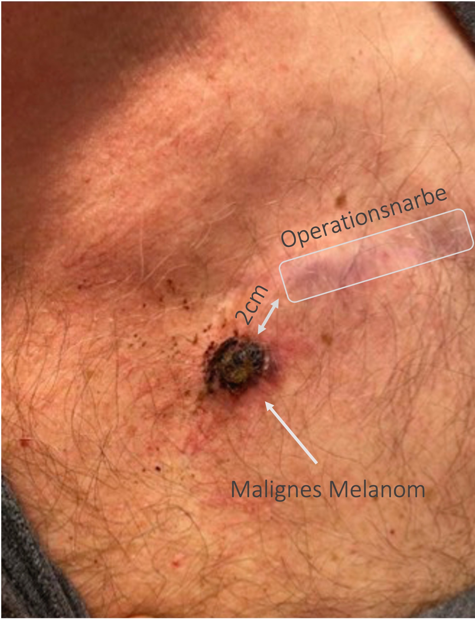 Hintergrund Auffälligkeiten im Bereich der Aggregattasche entsprechen, insbesondere bei zusätzlich vorhandenen systemischen Infektzeichen, häufig einem Tascheninfekt. Die leitliniengerechte Therapie besteht primär in der Gabe ausgewählter Antiinfektiva. Neben einer Tascheninfektion sollten aber auch andere, weniger häufige Differentialdiagnosen, berücksichtigt werden. Falldarstellung Ein 67-jähriger Patient erhielt 05/21 bei Batterieerschöpfung einen komplikationslosen Aggregatwechsel seines sekundärprophylaktisch implantierten Defibrillators mit kardialer Resynchronisationstherapie. Nach 07/21 unauffälligem ersten Follow-up erfolgte 11/21 eine außerplanmäßige Vorstellung, da der Patient eine Auffälligkeit an der Aggregattasche bemerkt hatte. Bei Inspektion zeigte sich eine kleine mit Schorf belegte kreisrunde Läsion ca. 2 cm unterhalb der eigentlichen Narbe ohne Infektzeichen. Bei Verdacht auf eine Tascheninfektion erfolgte der Beginn einer Antibiotikatherapie mit Eskalation bei notfallmäßiger stationärer Aufnahme aufgrund systemischer Infektzeichen mit Fieber. Zur weiterführenden Diagnostik bei nicht typischem, sezernierend und intermittierend blutigem, auffälligem Taschenbefund sowie Fieber und systemischen Infektzeichen erfolgte die Durchführung einer PET-CT Untersuchung, in der sich eine fokal mäßig FDG-anreichernde kutane Läsion im Bereich der Aggregattasche ohne Hinweis auf Sondeninfektion zeigte. Nach interdisziplinärer Beurteilung erfolgte bei V.a. einer Neoplasie unklarer Dignität DD Granuloma pyogenes eine Exzision mit histopathologischem Befund eines malignen Melanoms und Notwendigkeit der Nachresektion, postoperativ ohne Hinweis auf Residuen oder lokale Metastasierung. Der Patient befindet sich aktuell in dermatologischen Nachkontrollen, bisher ohne Hinweis auf ein Rezidiv oder Metastasierung. Diskussion Tascheninfektionen sind nicht selten und benötigen eine strukturierte und leitliniengerechte Diagnostik. Bei gesichertem Tascheninfekt ist meist eine komplette Systemextraktion erforderlich. Bei lokalen Auffälligkeiten, die sich 1) nicht im unmittelbaren Narbenareal befinden oder keinen Anschluss an das Narbenareal haben, 2) einen atypischen Lokalbefund mit Ulzeration, Sezernierung und Blutung zeigen oder 3) mit deutlichem zeitlichem Abstand zu einer vorangegangenen Operation entstehen, sollte differentialdiagnostisch aber auch an weitere Differentialdiagnosen gedacht werden. Neoplasien stellen eine seltene Differentialdiagnose dar und benötigen ggf. eine interdisziplinäre Beurteilung.