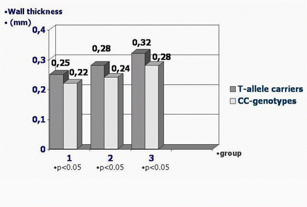 All patients were subjected to echocardiography, vessels ultrasound examination and PCR and RFLP analyses. After genotyping the patients were divided into 2 subgroups: T-allele carriers and C-homozygous patients. Results.The frequency of the 825T allele in the groups of hypertensives was significantly higher in comparison to the group of patients without blood pressure elevation. There were no TT-genotypes in the group 1, furthermore the frequency of CC-gomozygous patients in this group was significantly higher in comparison to the groups 2 and 3. The presence of T-allele was associated with radial artery hypertrophy in all groups.Vascular resistance was also significantly higher in T-allele carriers. No association between genotypes and carotid artery intima-media thickness or left ventricular hypertrophy was observed. |