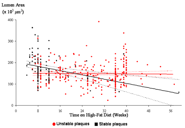 Lumen is Only Maintained When the Plaque is Unstable The growth of atherosclerotic plaques would gradually produce critical arterial narrowing were it not for compensatory enlargement of the vessel. This serves to maintain the lumen and thus the bloodflow, but can be overwhelmed if the plaque ruptures and a large thrombus rapidly forms. Most acute coronary events are thought to be caused by this sequence of events, but it is also known that many or most plaque ruptures do not result in clinical symptoms. Furthermore, the greatest degrees of vessel expansion are seen at sites where atherosclerotic plaque ruptures have occurred. It is usually assumed that vasoactive factors released from the thrombus drive the vessel expansion, but using the fat-fed apolipoprotein E knockout mouse model of plaque rupture we have found that vessel expansion over time is the normal state of affairs in the brachiocephalic artery; that plaque formation impedes this expansion, causing loss of lumen; and that plaque rupture is permissive for vessel expansion and necessary for the maintenance of the lumen. These data, accumulated from 446 mice that underwent scheduled termination with in situ perfusion fixation at normal arterial pressure, suggest that atherosclerotic plaque rupture may be a mechanism of normal vascular homeostasis. Furthermore, they suggest the startling possibility that plaque rupture is actually the consequence of vascular expansive remodelling. |