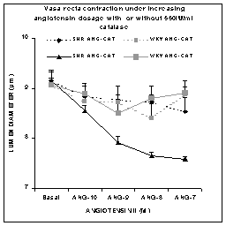 The renal medulla is involved in long-term blood pressure regulation. Angiotensin II (AngII) is known to act as a key regulator of renal medullary blood flow through effects on reactive oxygen species. The aim of the study was to determine whether angiotensin differentially affects vasa recta in young SHR and how far hydrogen peroxide is involved in this process. We used male 6-8 week old WKY (n=17) and SHR (n=18) and performed experiments on kidney slices (800μm) after kidneys were perfused and washed using standard buffer. The following incubations (10min) were performed; one on each slice: AngII 10-10-10-7M, AngII 10-10-10-7M plus 550IU/ml catalase, hydrogen peroxide 100μM, hydrogen peroxide 100μM plus 550IU/ml catalase. Kidneys were fixated, cut, stained for α-actin and thereafter diameter of 20 vasa recta per kidney slide were measured. Hydrogen peroxide of medullary tissue was photometrically determined under basal conditions and after AngII stimulation. Results show small inner-group and intra-rat standard deviations. Secondly, AngII dose-dependently enhanced contraction of vasa recta in young SHR (AngII 10-7M: -23±2%), but not WKY (AngII 10-7M: -3±2%). These results in young SHR can be neutralized by catalase (-6±3%), and contractility can be mimicked by hydrogen peroxide (-16±3%), although neither basal medullary content nor AngII stimulated hydrogen peroxide production differ between young SHR and WKY. |