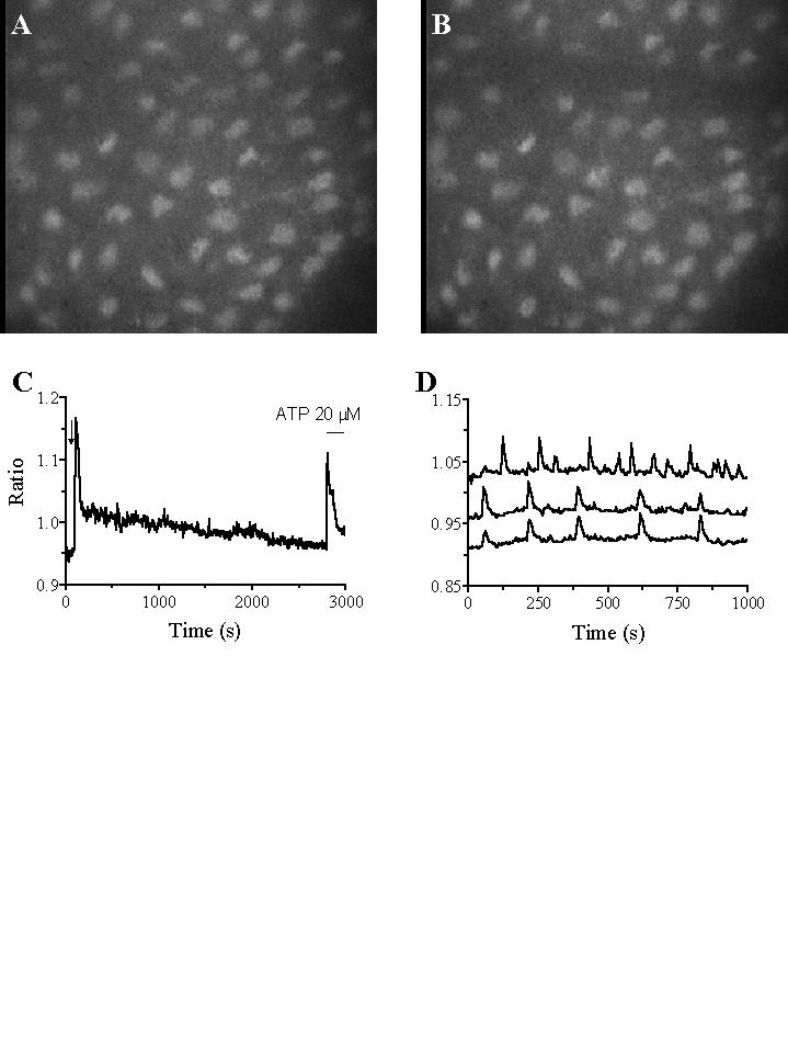 An intact patch of endothelium loaded by fura-2 is shown in Fig. 1A. Scraping a few ECs by a microelectrode (Fig. 1B) increases the [Ca2+]i in the adjacent 3–4 rows of cells, the greater the distance from the injury the smaller the [Ca2+]i increase. Ca2+ signals in ECs facing the injured area are here analysed. The injury causes a quick increase in [Ca2+]i, followed by a long-lasting decay (Fig. 1C). The Ca2+ signal is present in Ca2+-free solution, but is short-lasting. When suramine, a P2Y receptor blocker, is applied in a Ca2+-free solution, no response occurs. These data suggest that injured ECs release ATP, which causes a quick [Ca2+]i increase. Ca2+ influx also occurs, allowing a long-lasting Ca2+ signal. During the decay phase ECs are able to respond to ATP (Fig. 1C) and to retain fura-2 and exclude ethidium bromide, two molecules able to cross gap junctions. Furthermore, 1) U73122 and SK&F 96365 have no effect, 2) the gap junction blocker palmitoleic acid decreases the [Ca2+]i, 3) Verapamil has no effect. When applied during Ach-evoked Ca2+ signals, 1) U73122 and SK&F 96365 inhibit Ca2+ influx, 2) palmitoleic acid has no effect. After the injury, therefore, the hemichannels of those ECs which see injured ECs close, since ECs retain fura-2 and exclude ethidium bromide. Furthermore, Ca2+ influx occurs, but neither voltage-activated Ca2+-channels nor SOCs/RACCs are involved. The effect of palmitoleic acid suggests that hemichannels have a residual permeability to Ca2+, allowing a long-lasting Ca2+ influx. |